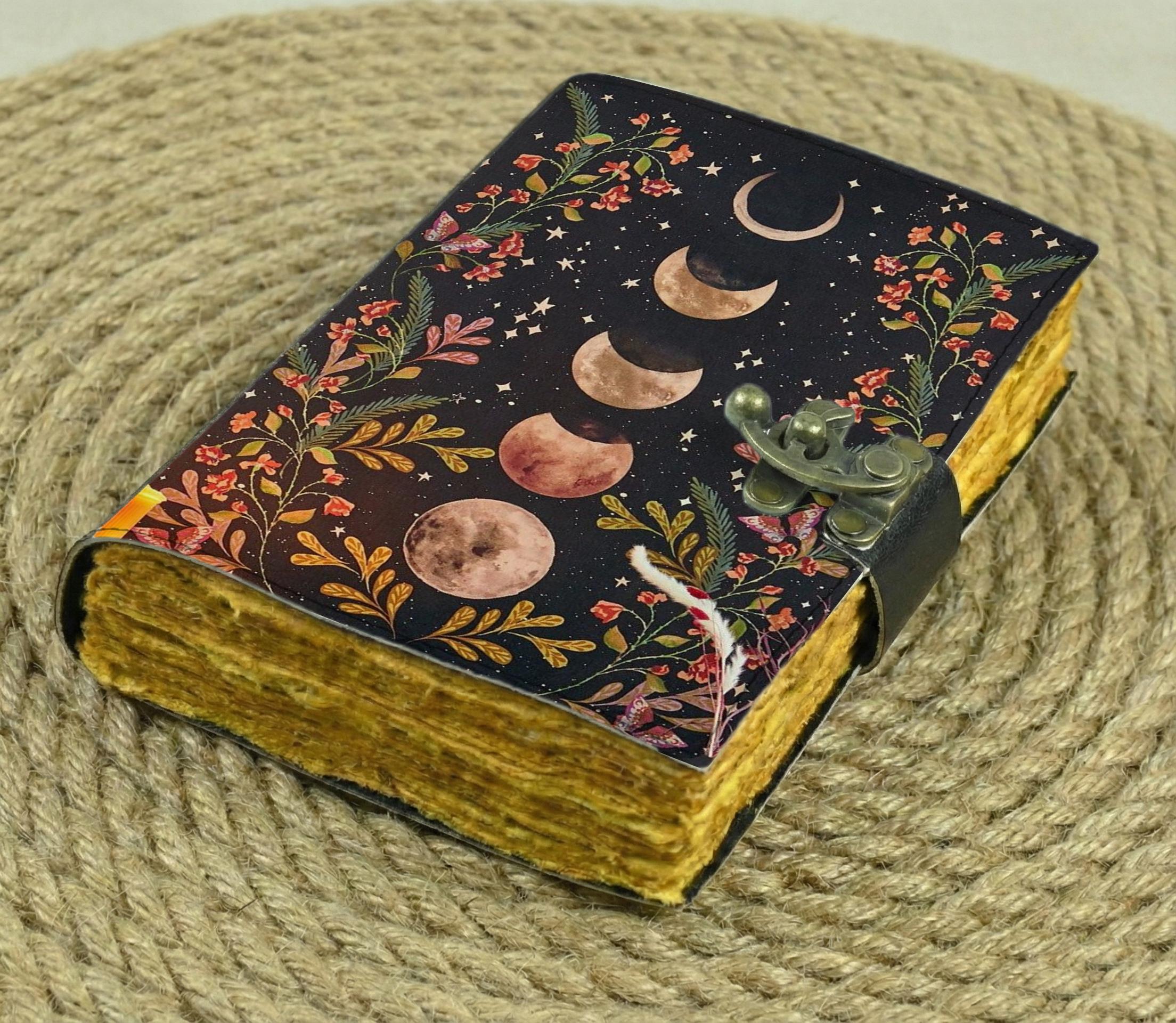 Moon Phase Leather Journal – Handmade Witchy Grimoire, Deckle Edge