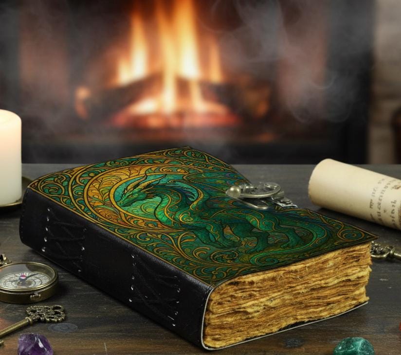 Unleash the power of imagination with this hand-crafted leather journal, featuring a breathtaking Celtic-style emerald dragon design wrapped in swirling golden patterns. A stunning piece for writers, witches, gamers, and collectors of mystical art.