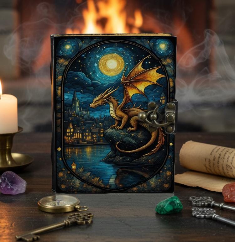 For dreamers, storytellers, witches, and dragon lovers β this handcrafted leather journal is designed to awaken imagination and magic. The cover features a majestic golden dragon perched above a glowing star-filled city under a radiant moon, engraved in stunning detail for an unforgettable fantasy aesthetic.