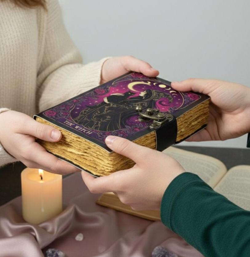 Every page is crafted to feel ancestral and ceremonial with hand-torn deckle parchment pages, making it perfect for writing spells, moon rituals, manifestation notes, tarot readings, dreams, and personal reflections. The antique brass lock secures your secrets, keeping your magic sacred and protected.