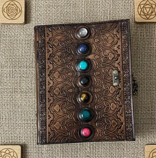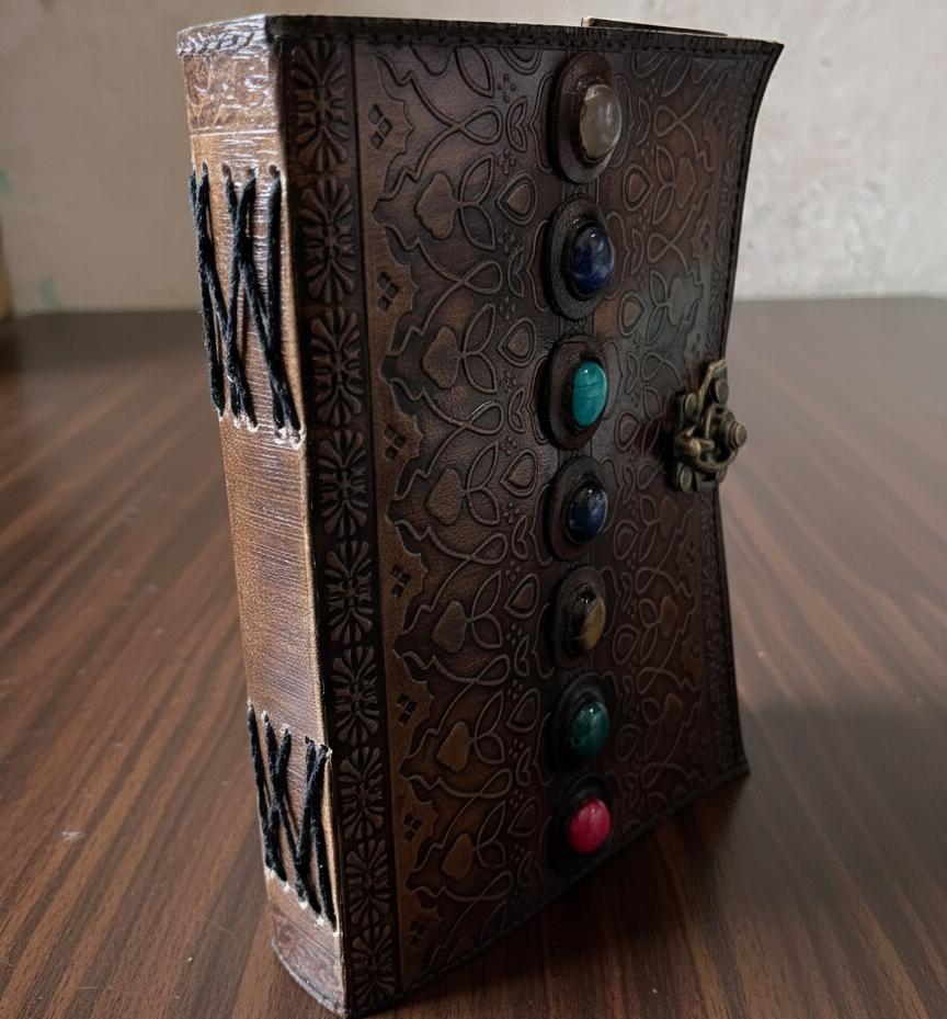 This handcrafted leather chakra journal features a beautifully embossed vintage leather cover, a secure antique metal lock, and seven healing chakra stones aligned along the front, symbolizing balance, energy, and mindfulness. Designed for spiritual seekers, writers, and creatives, this journal is both a functional notebook and a meaningful spiritual keepsake.