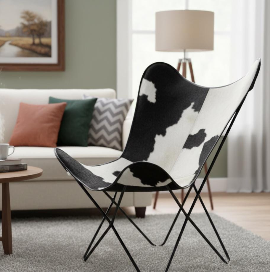 Elevate your space with this Handmade Hair-On Leather Butterfly Chair, a timeless icon of comfort and style. Crafted using genuine cowhide leather and a sturdy metal frame, this butterfly chair brings natural texture and modern elegance into any interior.