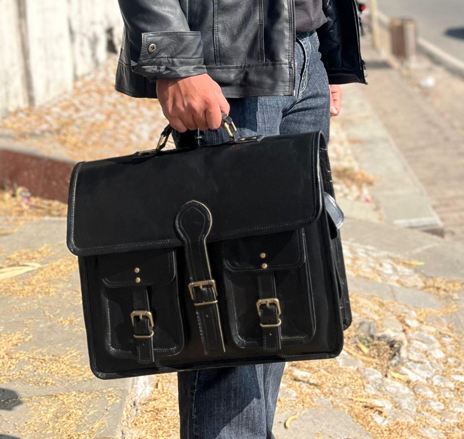 Upgrade your everyday carry with this handcrafted black leather briefcase — designed for style, durability, and daily practicality. Made from premium full-grain leather with a polished finish, it features a secure buckle-strap closure, a sturdy top handle, and two spacious front pockets for your essentials.