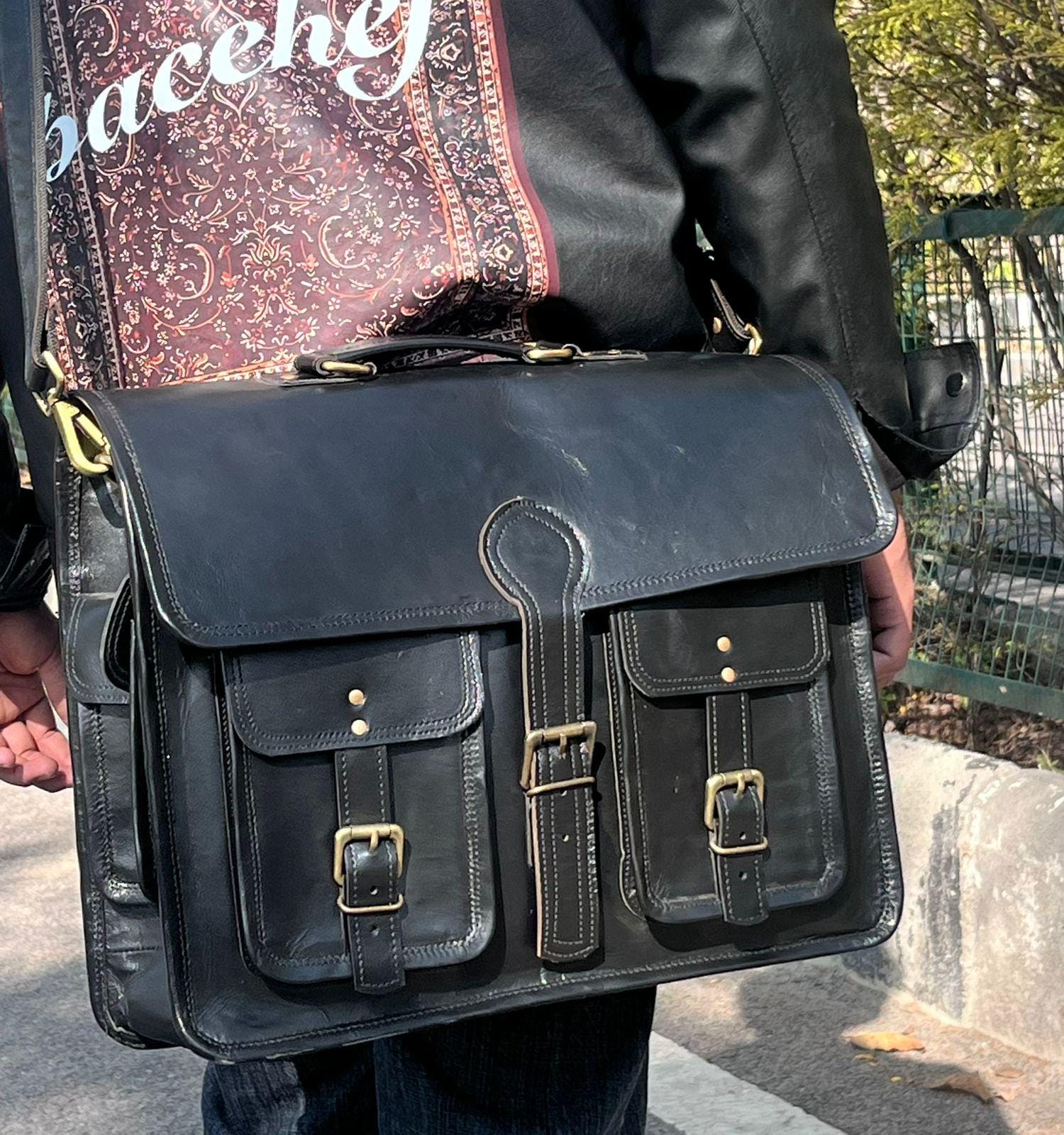 Handmade Black Leather Briefcase | Vintage Messenger Bag for Men & Women | Laptop Satchel with Dual Front Pockets | Business Work Bag