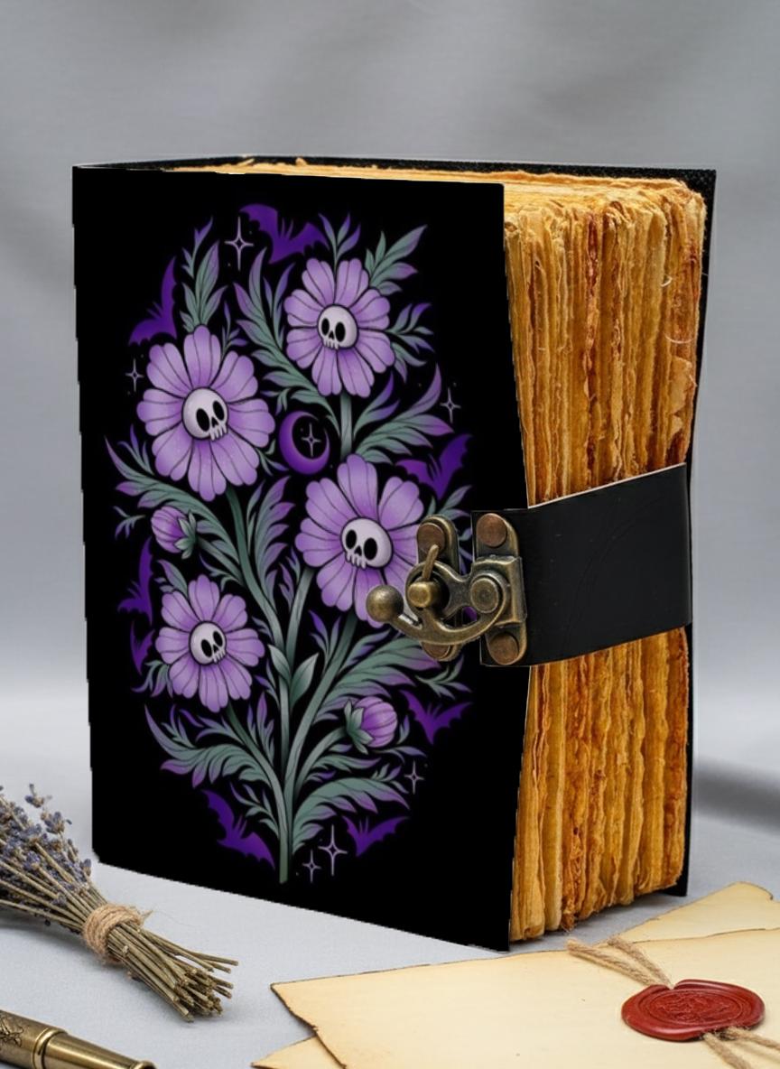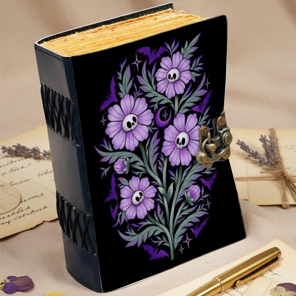 This unique handcrafted leather journal features a striking purple floral design with skull centers, blending gothic beauty with dark fantasy aesthetics. Set against a deep black background, the artwork symbolizes life, death, and rebirth—making this journal perfect for witchy writing, shadow work, poetry, or creative journaling.