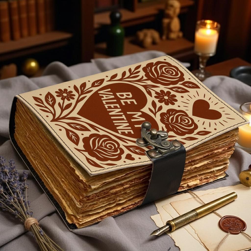 Celebrate love with this beautifully handcrafted leather journal, featuring a warm “Be My Valentine” heart design surrounded by floral artwork. Classic, romantic, and heartfelt, this journal is perfect for love letters, memories, poetry, or keeping special moments forever.
