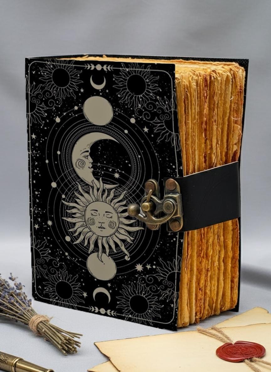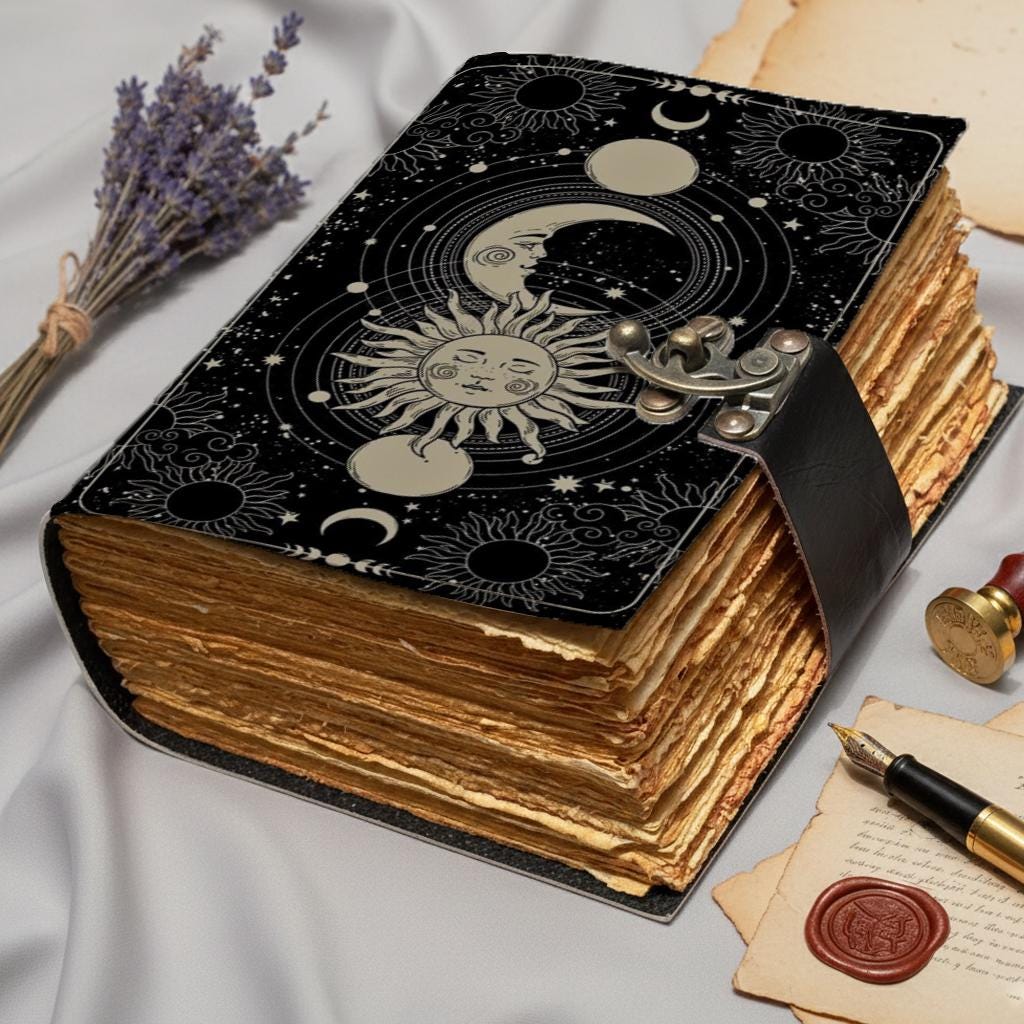 Sun and Moon Leather Journal – Handmade Astrology Notebook with Lock, Black Grimoire with Antique Deckle Edge Paper, Spiritual Writing Diary