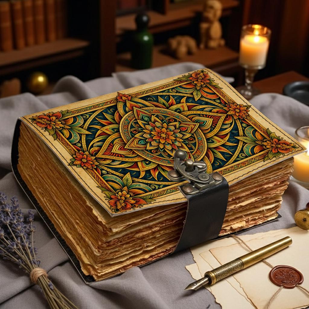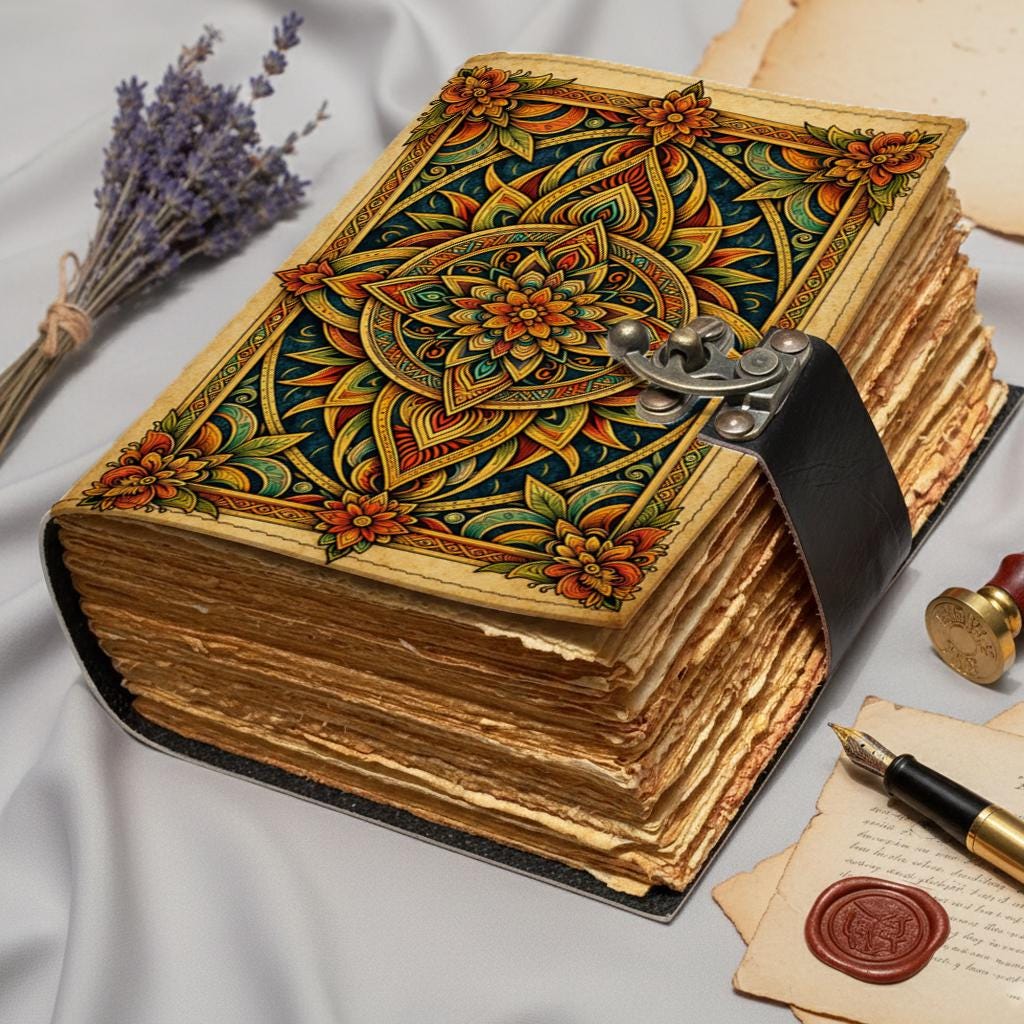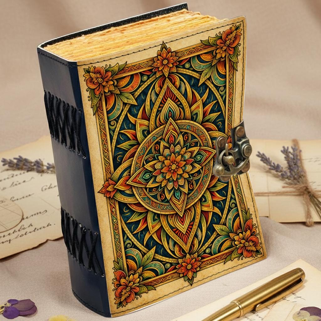 Mandala Leather Journal Handmade – Sacred Geometry Notebook with Lock, Antique Deckle Edge Paper, Floral Diary, Spiritual Writing Journal